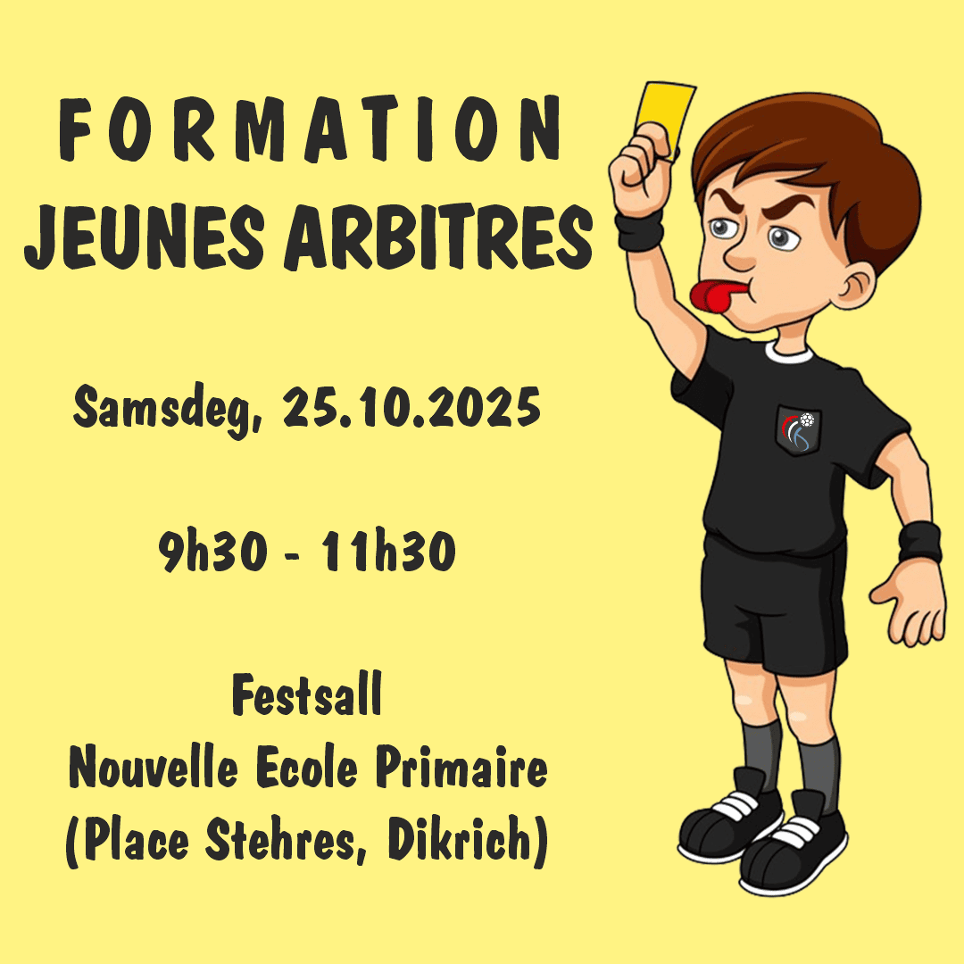 En Samsdeg, 25.10.2025 bidd d’FLH vun 9h30 – 11h30 eng Formatioun fir Jeunes Arbitres un. Dës Formatioun fönnt staat am Festsall vun der Nouvelle Ecole Primaire (Place Stehres) zu Dikrich.