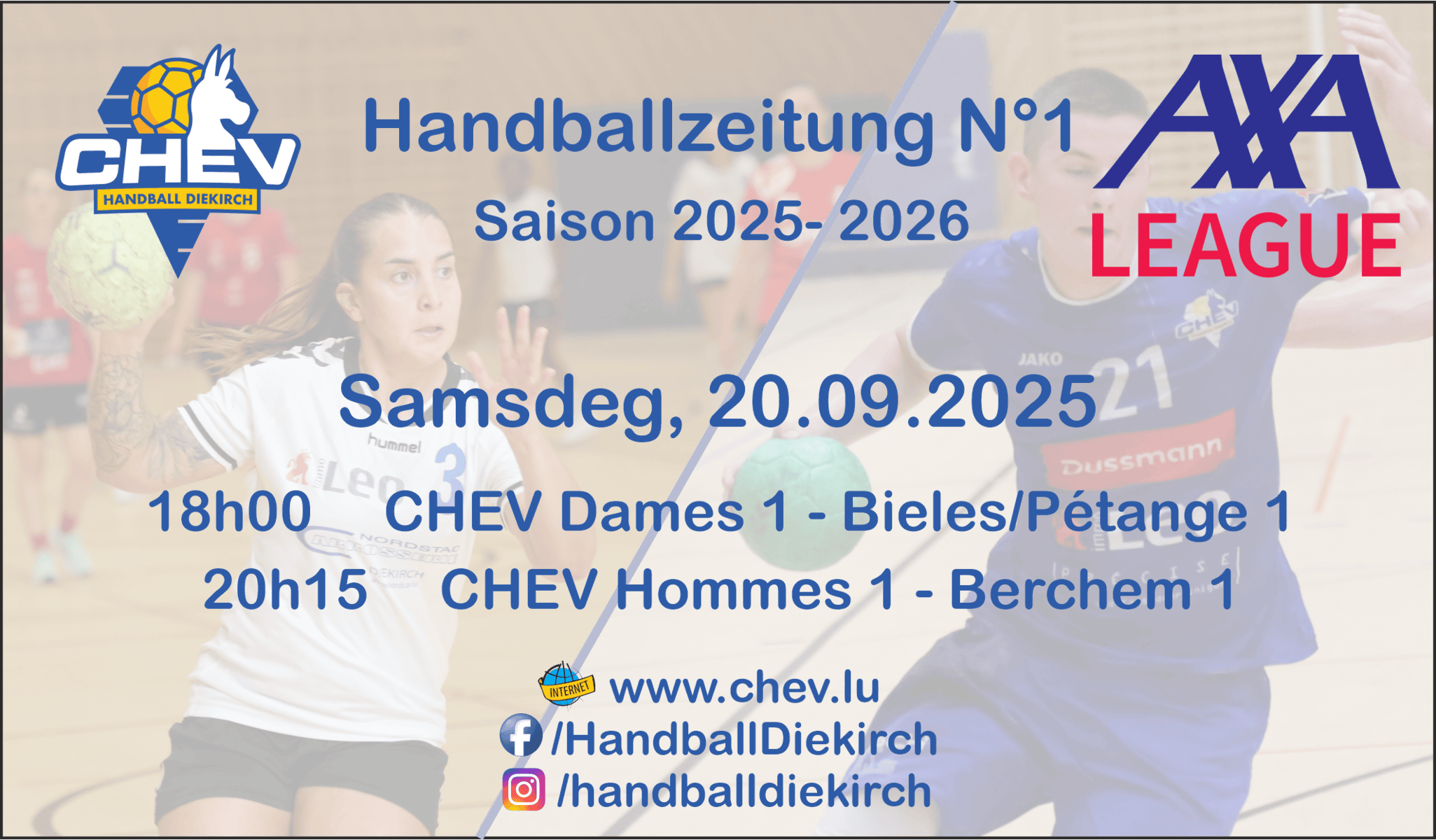 Mir géifen eis frée’en, wann Dir eis Equipen géift kräftig ënnerstëtzen kommen. Fir dës Mätcher hun mir och nees eis traditionell Handballzeitung am Online-Format.